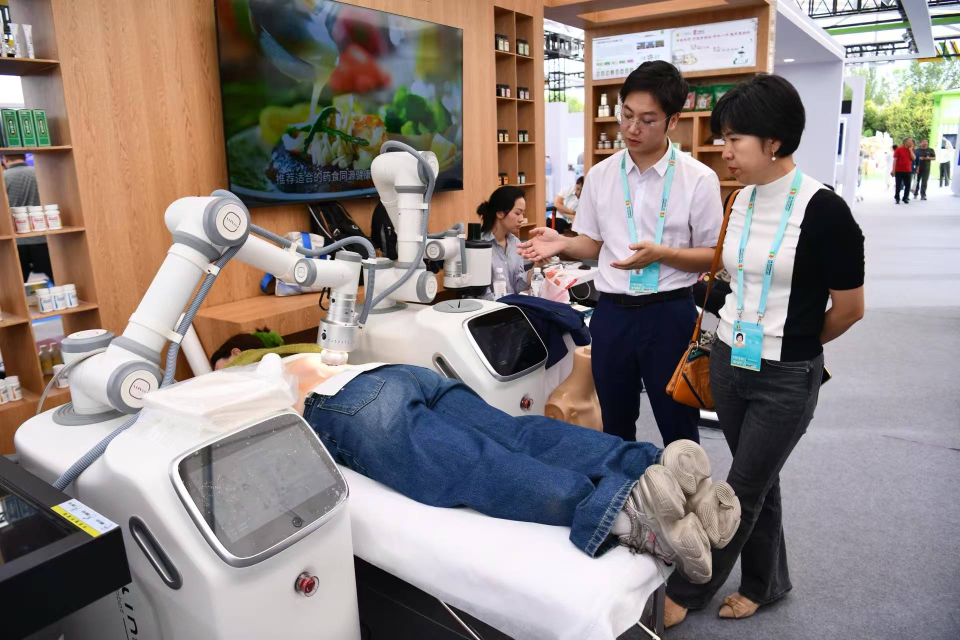 在“道智中医”展区,深圳智能机器人科技有限公司展示了两款“机器人老中医”:理疗机器人和艾灸机器人。其中,能量理疗机器人自带六维传感器,一指禅推拿、点穴按摩这些绝活,它都能完美复刻!力道稳、手法准,人力成本直降60%,能够保证每次理疗效果都一样靠谱。艾灸机器人让“悬灸神技”不再“烟熏火燎”,它能精准找到穴位、控制温度,让人体灸得再透也不烫皮。